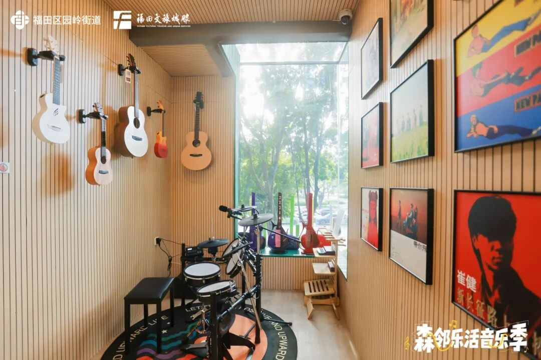 La sala de baterías cuenta con baterías electrónicas y guitarras inteligentes sin cuerdas con diapasones LED. Cortesía de Oficina de Cultura, Turismo y Servicios Urbanos de Futian