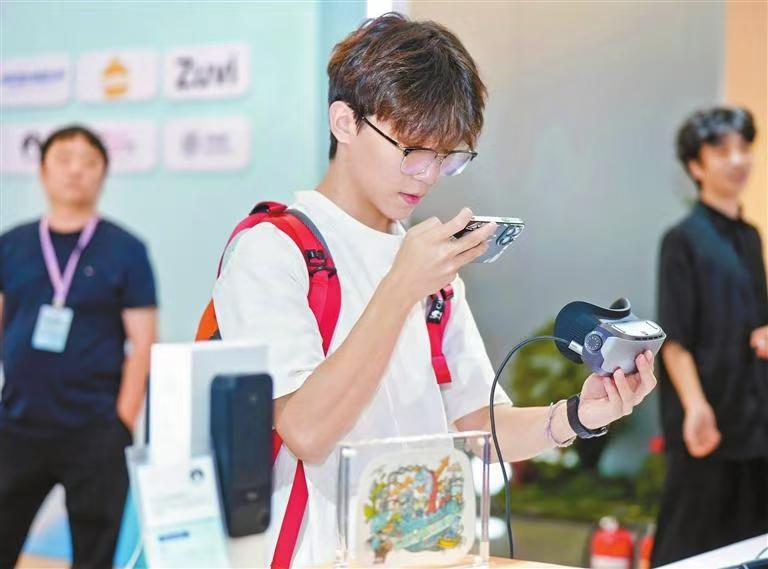 Un visitante tomando fotos de una pantalla 3D portátil de NedOptics en el área expositiva de la conferencia de HKUST en el Centro de Innovación Hetao el viernes. Al usarla, la pantalla ofrece imágenes de alta definición dentro de un campo de visión de 65 grados, equivalente a sentarse a unos 3,7 pies (0,91 metros) de un televisor de 65 pulgadas. Cortesía de los organizadores
