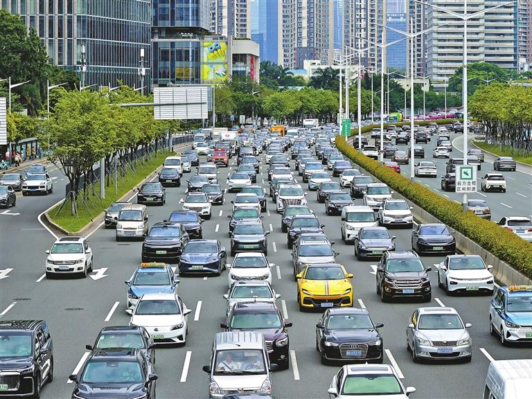 Ayer por la tarde, filas de vehículos serpenteaban a lo largo del Bulevar Binhe en el distrito de Futian mientras los residentes se apresuraban a regresar a sus casas luego de la suspensión de actividades laborales y comerciales en Shenzhen a las 14:00 horas debido al Supertifón Ragasa. Liu Xudong