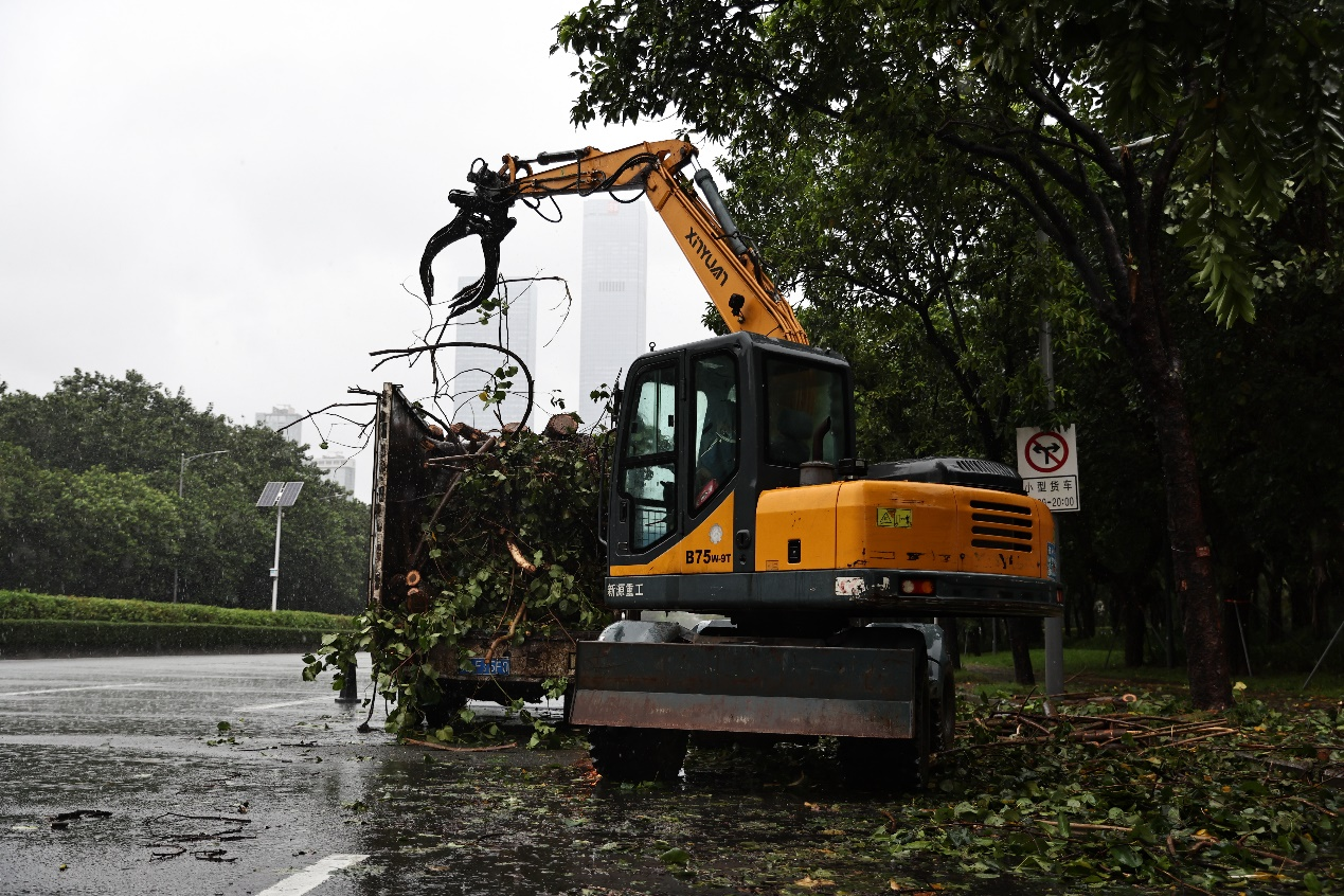 Ayer por la tarde, en la Carretera Huanggang en el distrito de Futian una grúa levantando ramas de árboles derribadas por el tifón Ragasa que pasó a unos 156km a la costa sur de Shenzhen esa mañana. Desde la noche del martes hasta las 07:30 de ayer, el tifón derribó 174 árboles en toda la ciudad, pero no se reportaron víctimas. A las 16:00 de ayer, Shenzhen levantó las suspensiones de clases, trabajo, producción, transporte público y operaciones comerciales. El tifón tocó tierra en la Isla de Hailing, en Yangjiang, provincia de Guangdong, alrededor de las 17:00 de ayer. Liu Xudong