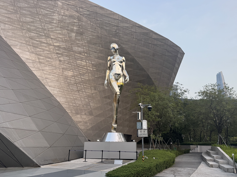 La escultura "Robot Sexy" de 12 metros de altura, que debutó en Shenzhen como un punto destacado de la exhibición individual "Luz, Transparencia, Reflexión" del reconocido artista contemporáneo japonés Hajime Sorayama en el Museo de Arte Contemporáneo y Urbanismo de Shenzhen en el distrito de Futian. Esta exhibición, la más grande de Sorayama hasta la fecha en el sur de China, estará abierta hasta el 11 de enero de 2026 y reúne más de 80 obras: pinturas, instalaciones, esculturas y piezas de nuevos medios creadas a lo largo de más de medio siglo. Lin Songtao